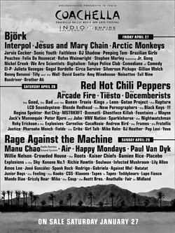 После нескольких месяцев переговоров, увещеваний и прямого подкупа, стал известен полный состав музыкантов и диджеев, готовящихся к трехдневному фестивалю, который традиционно пройдет в долине Coachella, в солнечном штате Калифорния.