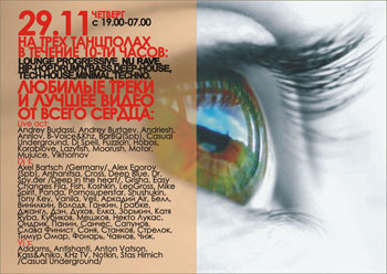 DJ`s: Axel Bartsch (Germany), Alex Egorov (Spb), Arshanitsa, Cross, Deep Blue, Dr. Spy.der (Deep in the heart), Grisha, Easy Changes, Filq, Fish, Koshkin, LeoGross, Mike Spirit, Panda, Pornosuperstar, Shushukin, Tony Key, Vanila, Vell, Анрилов, Аркадий Air, Белл, Винилкин, Володя, Ганкин, Грабке, Джангл, Дэн, Духов, Елка, Зорькин, Катя Ryba, Кубиков, Мешков, Некто Лукас, Ондрик, Панин, Санчес, Сапунов, Слава Финист, Соня, Станков, Стрелок, Тимур Омар, Фонарь, Чаянов, Чиж.